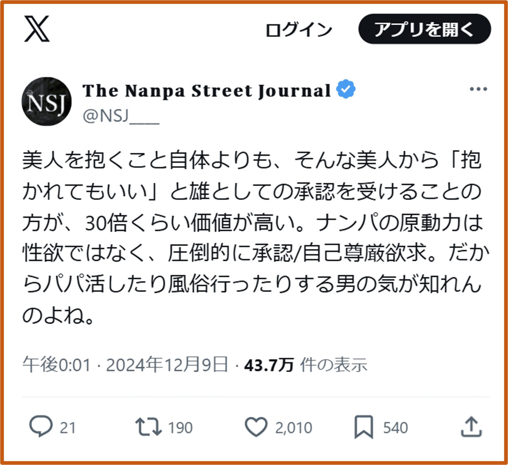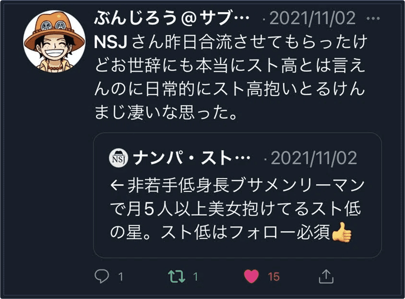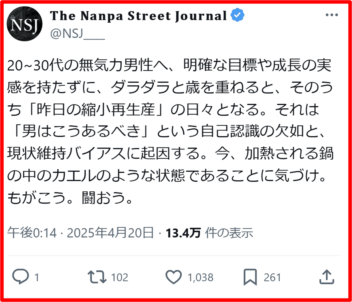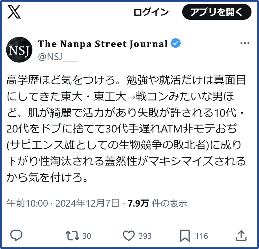 これをこじらせると、挙句の果てには、「20代十分に遊べなかった後悔」を肯定するために、認知的不協和に陥り、Xで遊び人・ナンパ師批判するおじさんになり下がる。