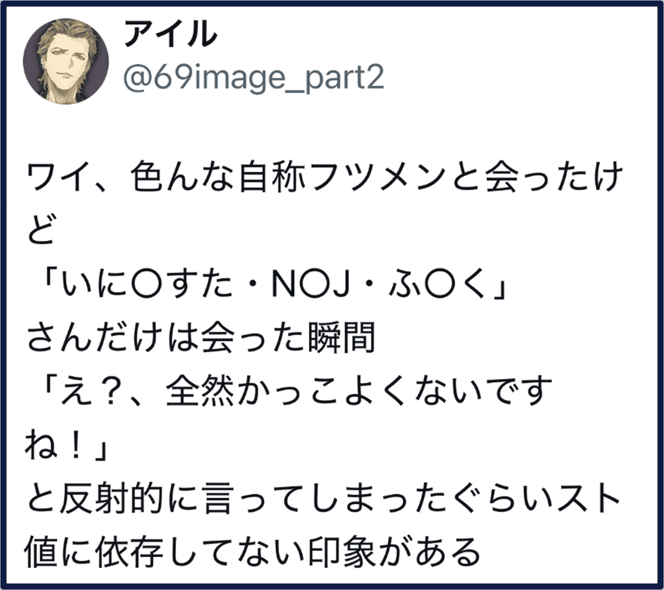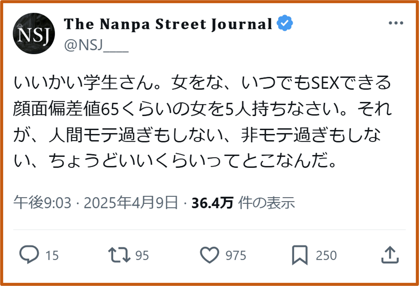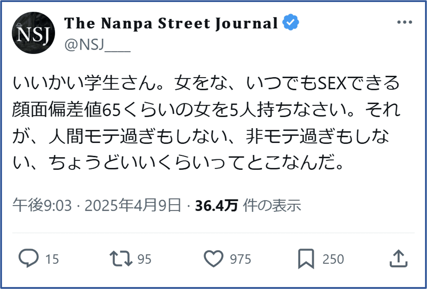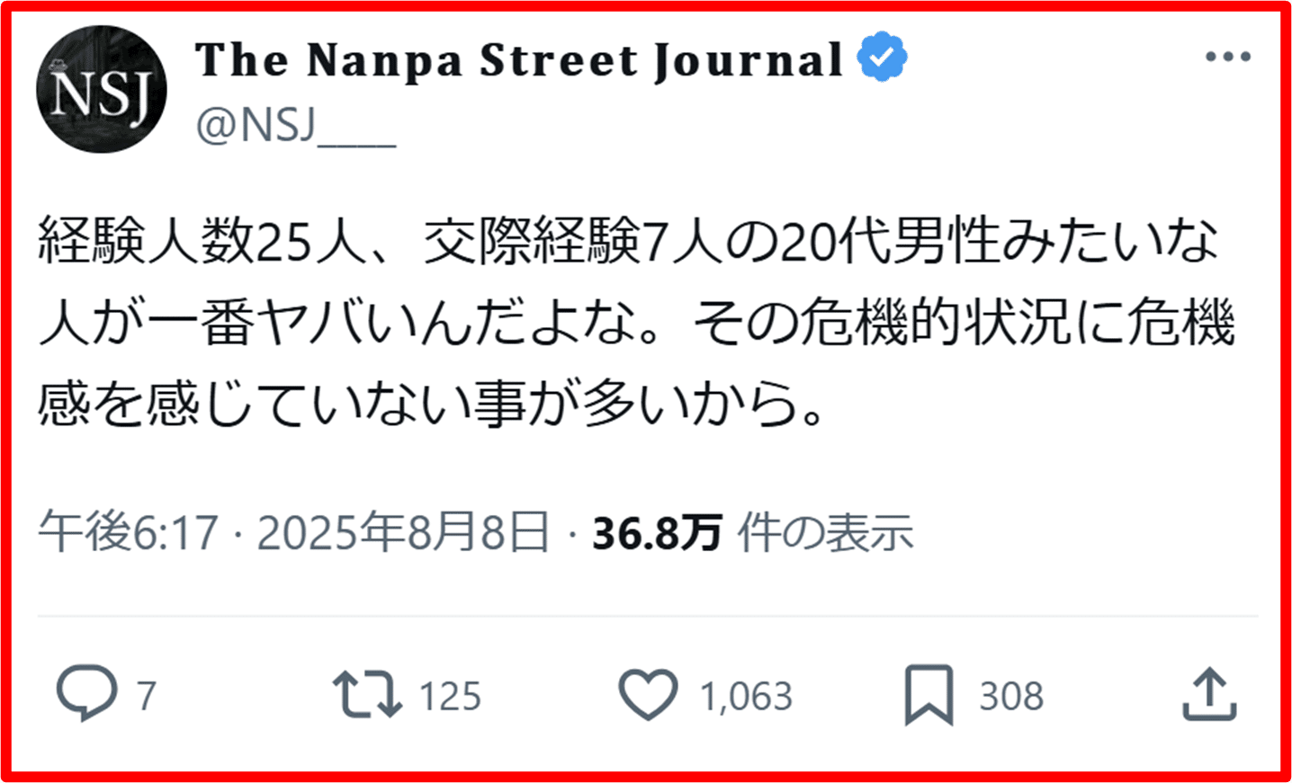 これをこじらせると、挙句の果てには、「20代十分に遊べなかった後悔」を肯定するために、認知的不協和に陥り、Xで遊び人・ナンパ師批判するおじさんになり下がる。