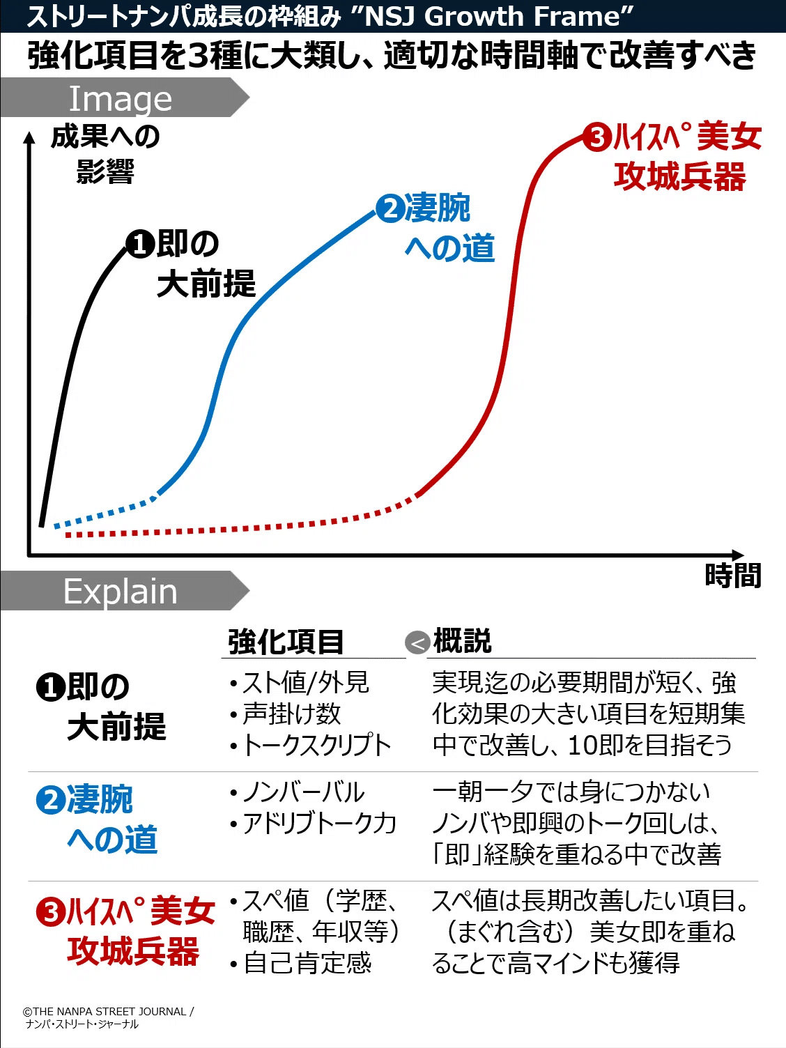 まずは「❶即の大前提」を獲得し、ストリート・クラブ・イベント・アプリ等多様なチャネルでのナンパで10即を目指す。次に「❷凄腕への道」として一朝一夕では改善しえない部分を地道に磨いていく。最後に「❸ハイスペ美女攻城兵器」を携え、理想の女性に照準を定めていく。