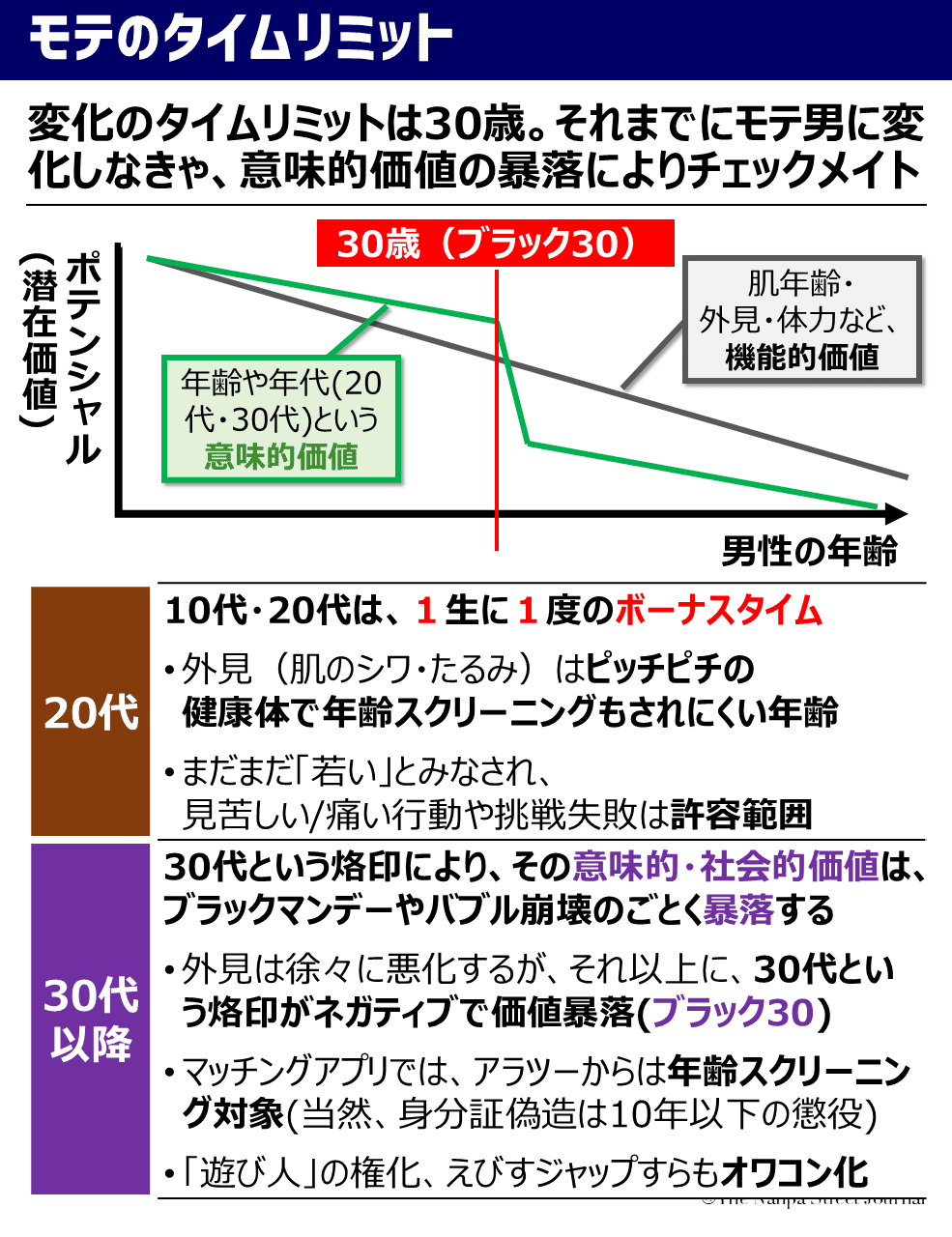 この壁を突破した瞬間を、30代は「ブラック30」、40代は「ブラック40」と呼ぶ。本書が推奨するのはブラック30に突入する前(遅くともブラック40に達する前)の問題解決である。