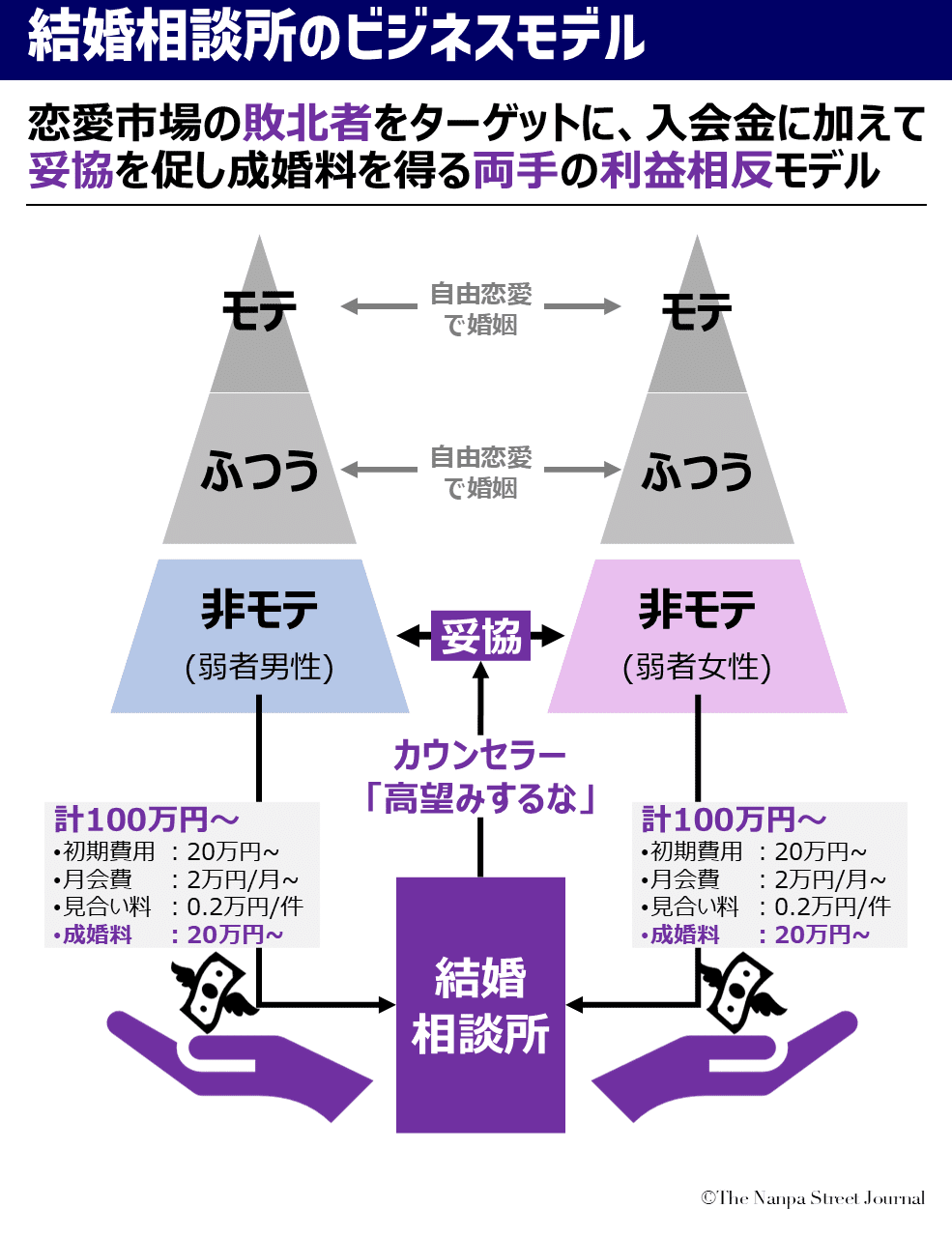「弱者男性のセーフティネット」などと信じてはアウト。その実態は搾取システムそのものである。ビジネス構造は不動産やM&A仲介で悪名高い「両手取引」と同じで、双方から成功報酬を取るため、依頼人の利益最大化など起こり得ない。相談所に金を落とす時点で、あなたの幸福は担保されない。