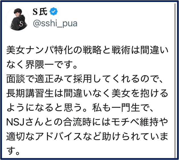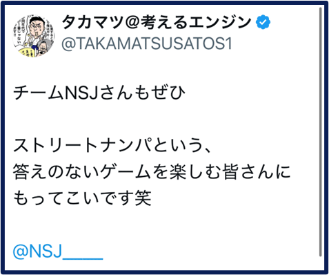 ストリートナンパの美女探索時間=遊休時間を価値に変えつつ、オープン率や連れ出し率を高める戦術。2025年現在でこれを実践しているスト師はいないといえるくらい独自性が高い。からすまるさんから好評