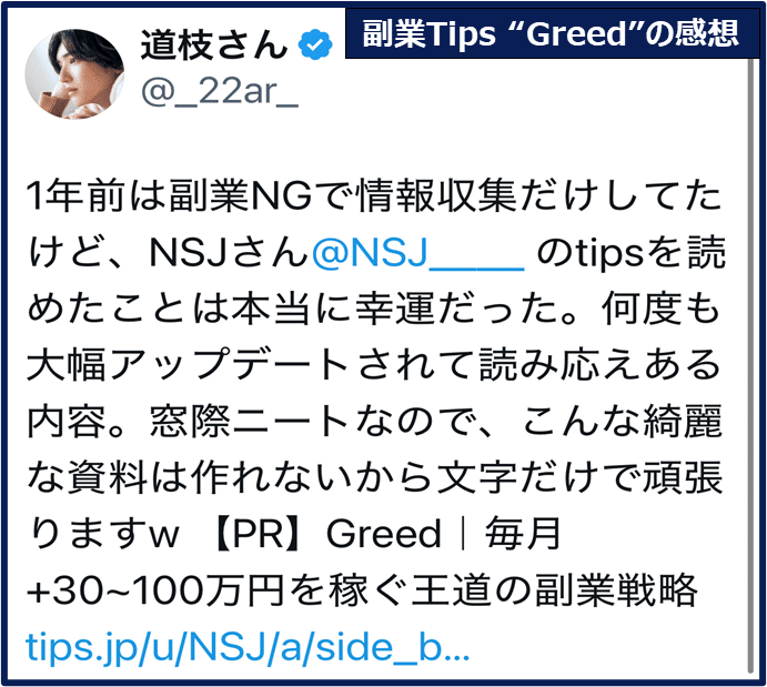 ※購入者特典で閲覧パスワード配布 - The GREED|王道の副業戦略(★★☆☆☆)中長期的に実現していくものではあるが、軟派も恋愛も結婚も子育ても、すべて金がかかるので、所得増(=原始時代でいう狩りのスキル)はサピエンス雄にとって永遠の課題である。副業によって収入を+10~100万/月する方法を解説