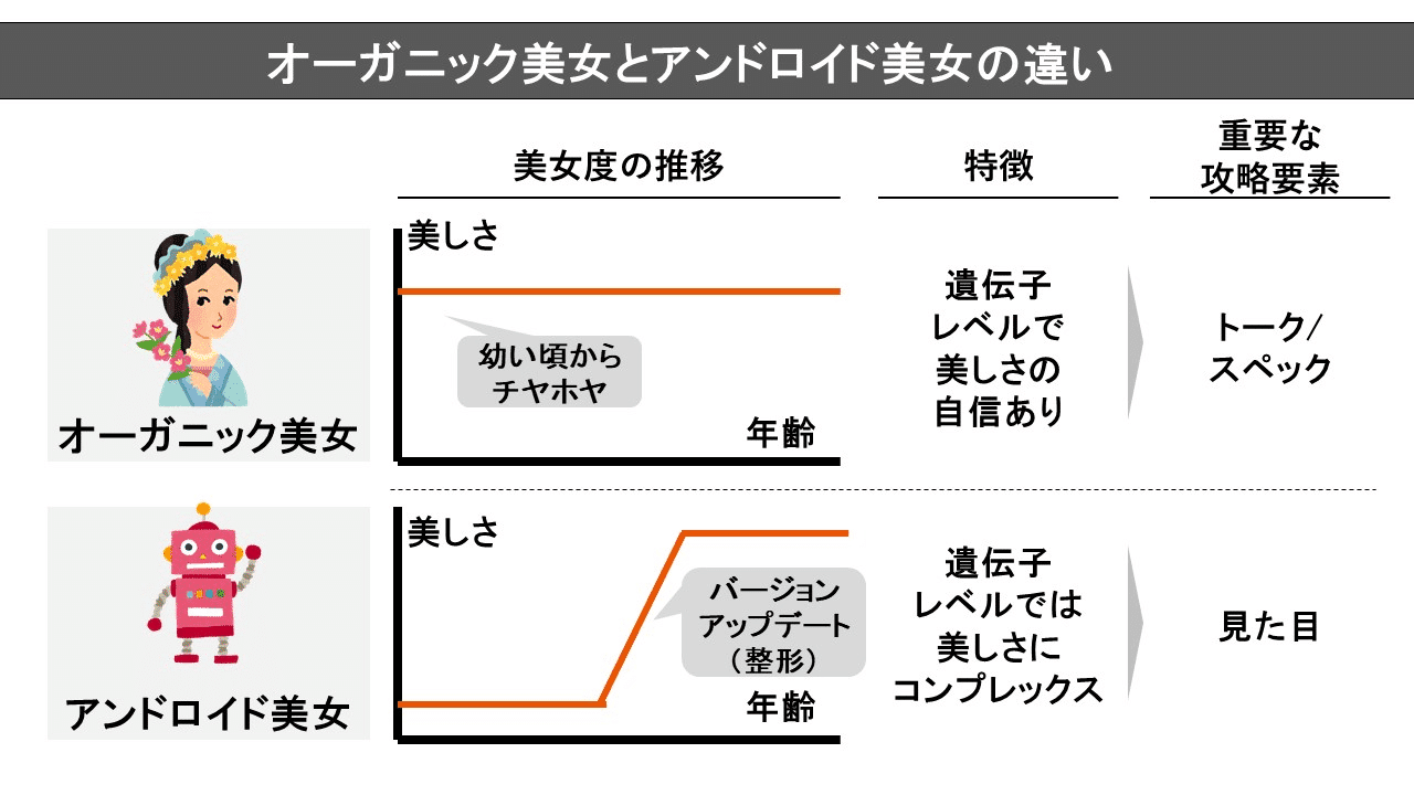 スト値(外見レベル)をどう定義し、カテゴライズすると顧客像が分かれるかについて深堀。また、天然美女(オーガニック美女)とアンドロイド美女の生態や攻略要因の違いについても解説。 - 軟派戦略思考(★★★☆☆)