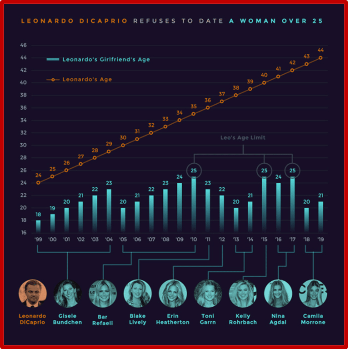 実際、レオナルド・ディカプリオですら、パートナーの外見が劣化するたびに“若くて外見のよい女性”に乗り換えており、“Dicaprio 25″というネットミームになった。